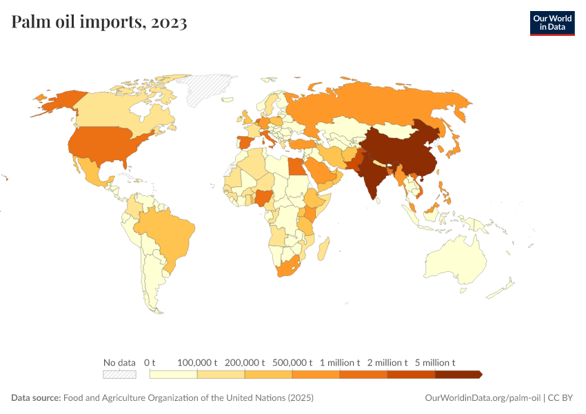 “Data Page: Imports of palm oil”. Our World in Data (2026). Data adapted from Food and Agriculture Organization of the United Nations. Retrieved from https://data-archive-fasttrack-step.owid.pages.dev:8789/20260226-122020/grapher/palm-oil-imports.html [online resource] (archived on February 26, 2026).How to cite this data