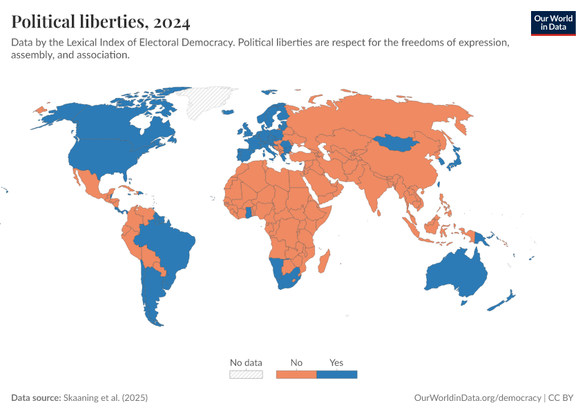 “Data Page: Political liberties”, part of the following publication: Bastian Herre, Lucas Rodés-Guirao, and Esteban Ortiz-Ospina (2013) - “Democracy”. Data adapted from Skaaning et al.. Retrieved from https://data-archive-fasttrack-step.owid.pages.dev:8789/20260119-065148/grapher/political-liberties-lexical.html [online resource] (archived on January 19, 2026).How to cite this data
