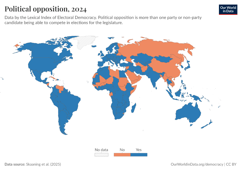 Skaaning et al. (2025) – processed by Our World in Data. “Political opposition” [dataset]. Skaaning et al., “Lexical Index of Electoral Democracy (LIED) v6.8” [original data]. Retrieved March 2, 2026 from https://data-archive-fasttrack-step.owid.pages.dev:8789/20260119-065148/grapher/political-opposition-lexical.html (archived on January 19, 2026).