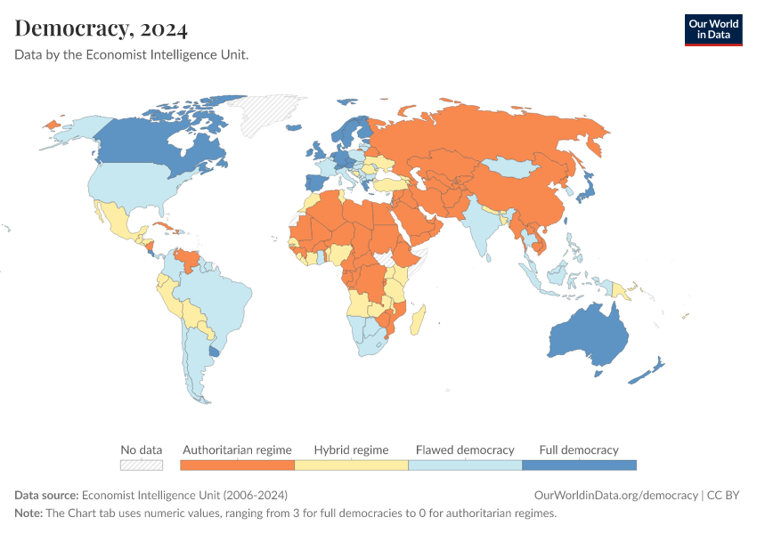 Economist Intelligence Unit (2006-2024) – processed by Our World in Data. “Democracy” [dataset]. Economist Intelligence Unit, “Democracy Index 2021: The China challenge”; Economist Intelligence Unit, “Democracy Index 2022: Frontline democracy and the battle for Ukraine”; Economist Intelligence Unit, “Democracy Index 2023: Age of Conflict”; Economist Intelligence Unit, “Democracy Index 2024: What's wrong with representative democracy?”; Gapminder, “Democracy Index v4” [original data]. Retrieved March 2, 2026 from https://data-archive-fasttrack-step.owid.pages.dev:8789/20260105-133053/grapher/political-regime-eiu.html (archived on January 5, 2026).