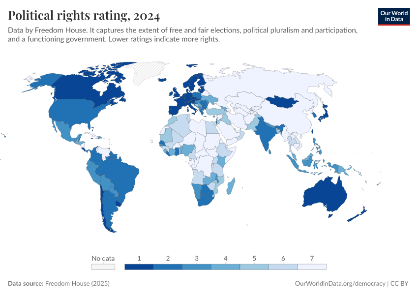 Freedom House (2025) – processed by Our World in Data. “Political rights rating” [dataset]. Freedom House, “Freedom in the World” [original data]. Retrieved March 2, 2026 from https://data-archive-fasttrack-step.owid.pages.dev:8789/20260119-070102/grapher/political-rights-rating-fh.html (archived on January 19, 2026).