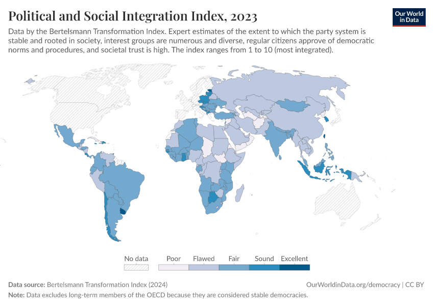 “Data Page: Political and Social Integration Index”, part of the following publication: Bastian Herre, Lucas Rodés-Guirao, and Esteban Ortiz-Ospina (2013) - “Democracy”. Data adapted from Bertelsmann Transformation Index. Retrieved from https://data-archive-fasttrack-step.owid.pages.dev:8789/20260105-133053/grapher/political-social-integration-index-bti.html [online resource] (archived on January 5, 2026).How to cite this data