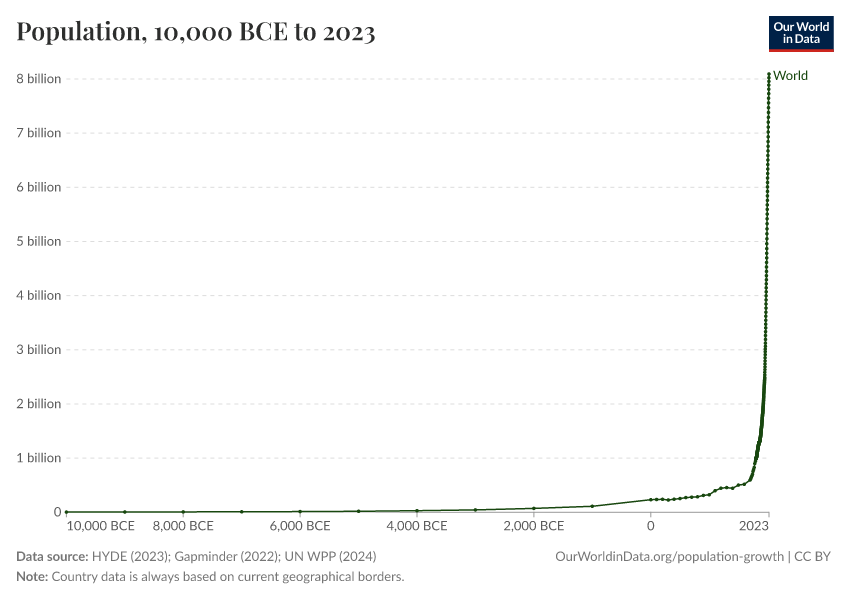 HYDE (2023); Gapminder (2022); UN WPP (2024) – with major processing by Our World in Data. “Population – HYDE, Gapminder, UN – Long-run data” [dataset]. PBL Netherlands Environmental Assessment Agency, “History Database of the Global Environment 3.3”; Gapminder, “Population v7”; United Nations, “World Population Prospects”; Gapminder, “Systema Globalis” [original data]. Retrieved March 2, 2026 from https://data-archive-fasttrack-step.owid.pages.dev:8789/20260119-065148/grapher/population.html (archived on January 19, 2026).