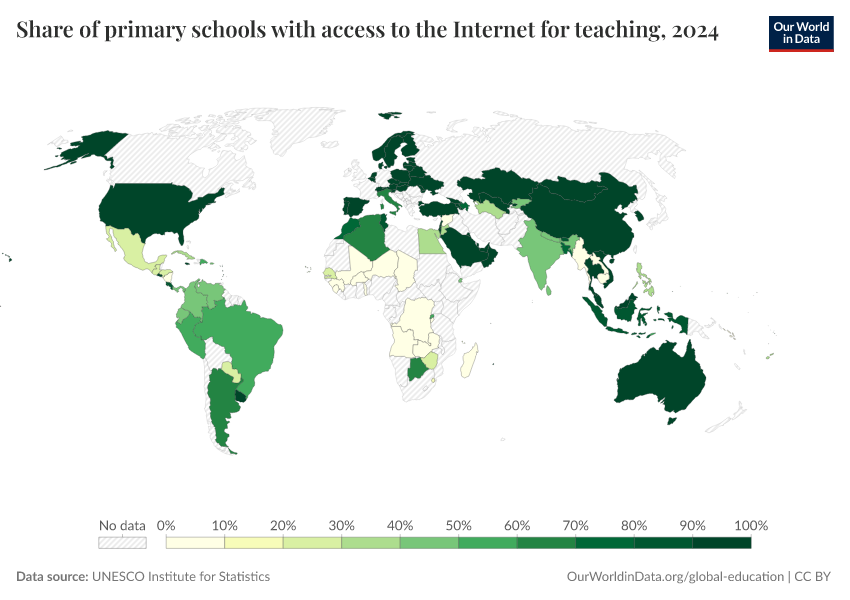“Data Page: Share of primary schools with access to the Internet for teaching”. Our World in Data (2026). Data adapted from UNESCO Institute for Statistics. Retrieved from https://data-archive-fasttrack-step.owid.pages.dev:8789/20260130-180113/grapher/primary-schools-with-access-to-internet.html [online resource] (archived on January 30, 2026).How to cite this data