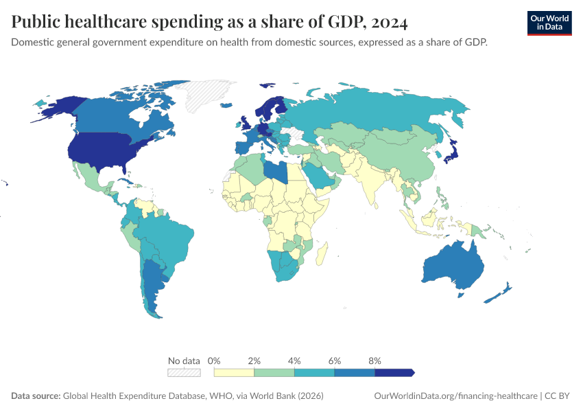 “Data Page: Public healthcare spending as a share of GDP”. Our World in Data (2026). Data adapted from Global Health Expenditure Database, WHO, via World Bank. Retrieved from https://data-archive-fasttrack-step.owid.pages.dev:8789/20260301-083443/grapher/public-healthcare-spending-share-gdp.html [online resource] (archived on March 1, 2026).How to cite this data