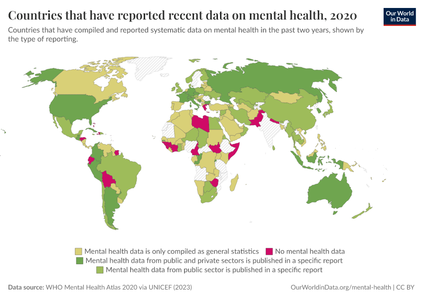 “Data Page: Countries that have reported recent data on mental health”, part of the following publication: Saloni Dattani, Lucas Rodés-Guirao, Hannah Ritchie, and Max Roser (2023) - “Mental Health”. Data adapted from WHO Mental Health Atlas 2020 via UNICEF. Retrieved from https://data-archive-fasttrack-step.owid.pages.dev:8789/20260224-141219/grapher/reporting-of-mental-health-system-data-in-the-past-two-years.html [online resource] (archived on February 24, 2026).How to cite this data