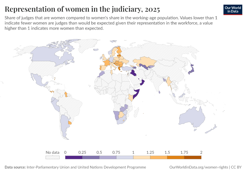“Data Page: Representation of women in the judiciary”. Our World in Data (2026). Data adapted from Inter-Parliamentary Union and United Nations Development Programme. Retrieved from https://data-archive-fasttrack-step.owid.pages.dev:8789/20260105-133053/grapher/representation-of-women-in-the-judiciary.html [online resource] (archived on January 5, 2026).How to cite this data