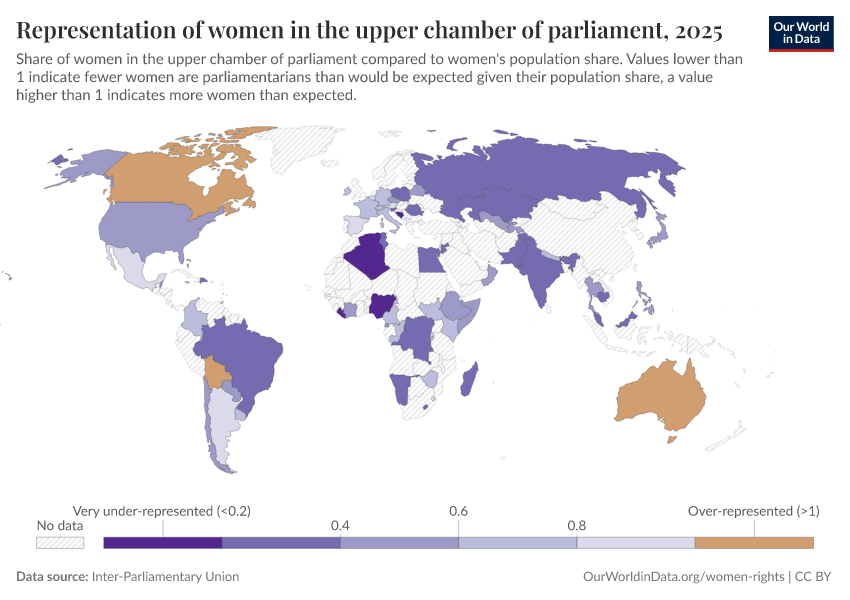 “Data Page: Representation of women in the upper chamber of parliament”. Our World in Data (2026). Data adapted from Inter-Parliamentary Union. Retrieved from https://data-archive-fasttrack-step.owid.pages.dev:8789/20260130-180113/grapher/representation-of-women-in-the-upper-chamber-of-parliament.html [online resource] (archived on January 30, 2026).How to cite this data