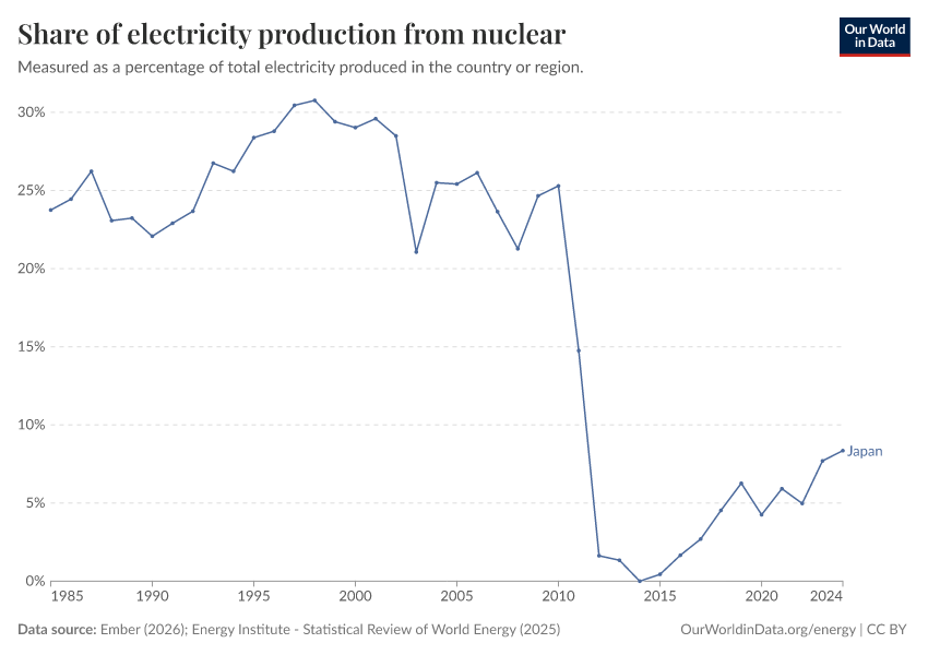 Ember (2026); Energy Institute - Statistical Review of World Energy (2025) – with major processing by Our World in Data. “Share of electricity generated by nuclear power” [dataset]. Ember, “Yearly Electricity Data Europe”; Ember, “Yearly Electricity Data”; Energy Institute, “Statistical Review of World Energy” [original data]. Retrieved March 2, 2026 from https://data-archive-fasttrack-step.owid.pages.dev:8789/20260203-171503/grapher/share-electricity-nuclear.html (archived on February 3, 2026).