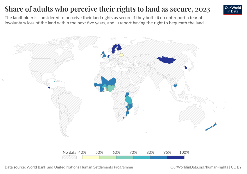 “Data Page: Share of adults who perceive their rights to land as secure”. Our World in Data (2026). Data adapted from World Bank and United Nations Human Settlements Programme. Retrieved from https://data-archive-fasttrack-step.owid.pages.dev:8789/20251121-151713/grapher/share-of-adults-who-perceive-their-rights-to-land-as-secure.html [online resource] (archived on November 21, 2025).How to cite this data