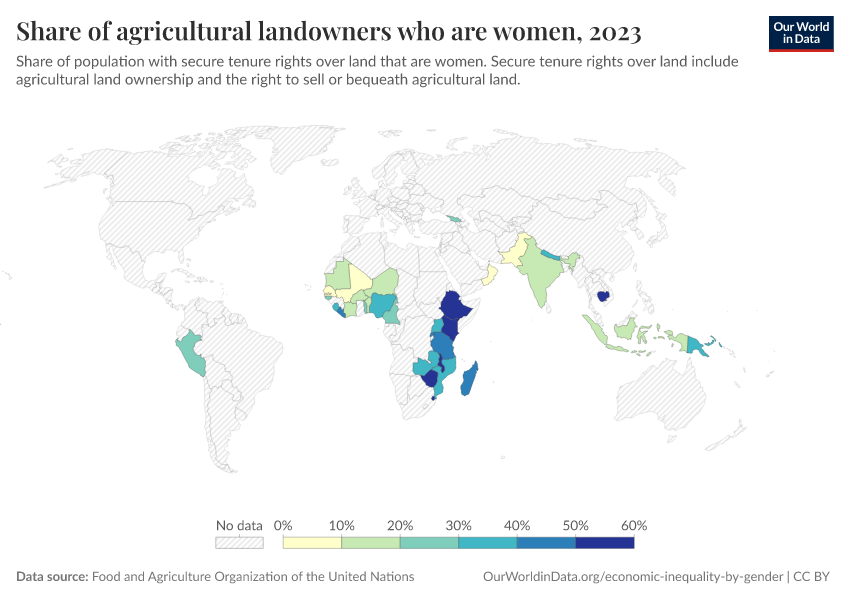 “Data Page: Share of agricultural landowners who are women”. Our World in Data (2026). Data adapted from Food and Agriculture Organization of the United Nations. Retrieved from https://data-archive-fasttrack-step.owid.pages.dev:8789/20260105-133053/grapher/share-of-agricultural-land-owners-that-are-women.html [online resource] (archived on January 5, 2026).How to cite this data