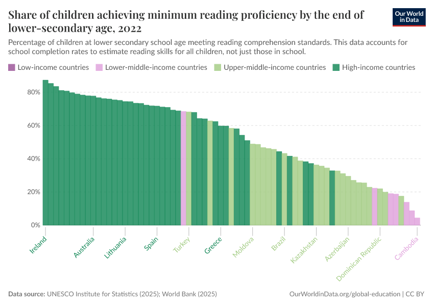 “Data Page: Share of children achieving minimum reading proficiency by the end of lower secondary age”, part of the following publication: Hannah Ritchie, Veronika Samborska, Esteban Ortiz-Ospina, and Max Roser (2023) - “Global Education”. Data adapted from UNESCO Institute for Statistics. Retrieved from https://data-archive-fasttrack-step.owid.pages.dev:8789/20260122-091445/grapher/share-of-children-reaching-sufficient-reading-comprehension-by-the-end-of-lower-secondary-age.html [online resource] (archived on January 22, 2026).How to cite this data