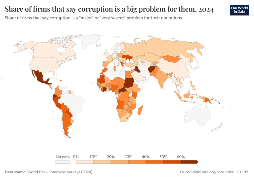 World Bank Enterprise Surveys (2024) – with minor processing by Our World in Data. “Share of firms that say corruption is a big problem for them” [dataset]. World Bank Enterprise Surveys, “Enterprise Surveys - Corruption” [original data]. Retrieved March 2, 2026 from https://data-archive-fasttrack-step.owid.pages.dev:8789/20251209-133038/grapher/share-of-firms-that-say-corruption-is-a-big-problem-for-them.html (archived on December 9, 2025).