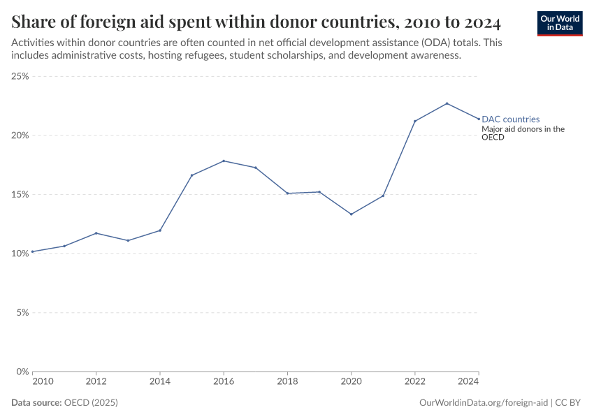 OECD (2025) – with minor processing by Our World in Data. “Share of foreign aid spent within donor countries – Net disbursements” [dataset]. OECD, “OECD Official Development Assistance (ODA) - DAC1: Flows by provider (ODA+OOF+Private)” [original data]. Retrieved March 2, 2026 from https://data-archive-fasttrack-step.owid.pages.dev:8789/20251230-141326/grapher/share-of-foreign-aid-spent-within-donor-countries.html (archived on December 30, 2025).