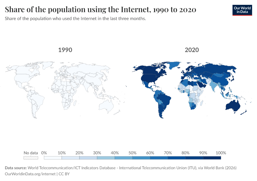 World Telecommunication/ICT Indicators Database - International Telecommunication Union (ITU), via World Bank (2026) – with minor processing by Our World in Data. “Share of the population using the Internet – International Telecommunication Union” [dataset]. World Telecommunication/ICT Indicators Database - International Telecommunication Union (ITU), via World Bank, “World Development Indicators 125” [original data]. Retrieved March 2, 2026 from https://data-archive-fasttrack-step.owid.pages.dev:8789/20260301-082651/grapher/share-of-individuals-using-the-internet.html (archived on March 1, 2026).