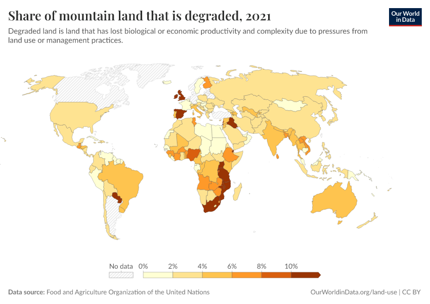 “Data Page: Share of mountain land that is degraded”. Our World in Data (2026). Data adapted from Food and Agriculture Organization of the United Nations. Retrieved from https://data-archive-fasttrack-step.owid.pages.dev:8789/20260130-180113/grapher/share-of-mountain-land-that-is-degraded.html [online resource] (archived on January 30, 2026).How to cite this data
