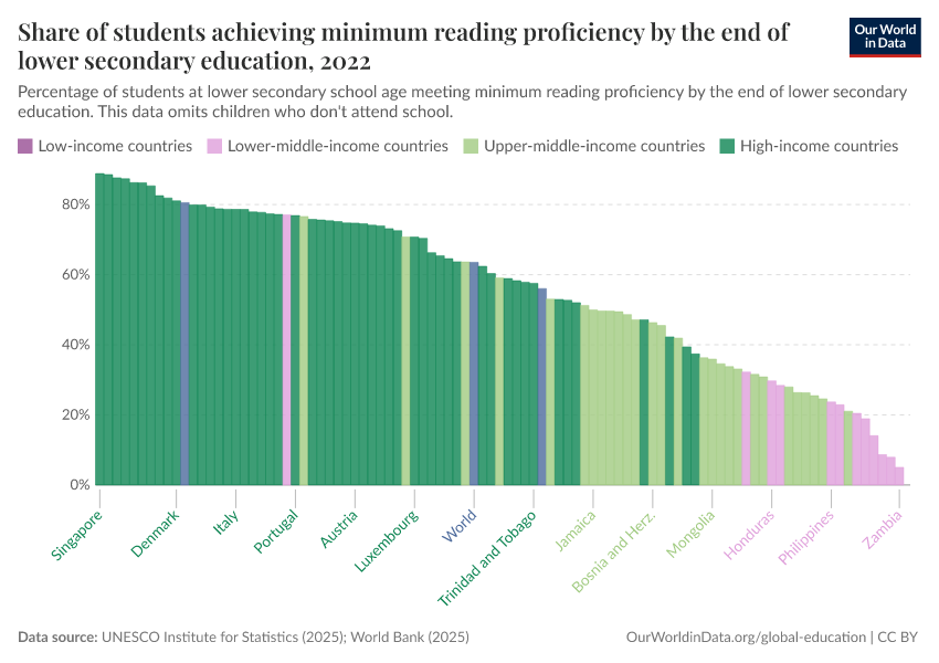 “Data Page: Share of students achieving minimum reading proficiency by the end of lower secondary education”, part of the following publication: Hannah Ritchie, Veronika Samborska, Esteban Ortiz-Ospina, and Max Roser (2023) - “Global Education”. Data adapted from UNESCO Institute for Statistics. Retrieved from https://data-archive-fasttrack-step.owid.pages.dev:8789/20260122-091445/grapher/share-of-students-at-end-of-lower-secondary-education-with-minimum-reading-proficiency.html [online resource] (archived on January 22, 2026).How to cite this data