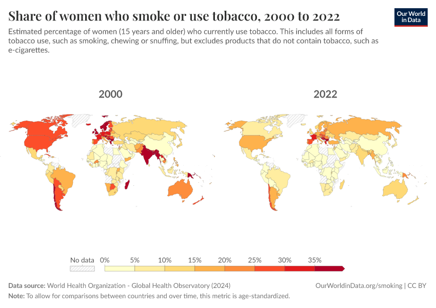 “Data Page: Share of women who smoke or use tobacco”, part of the following publication: Hannah Ritchie and Max Roser (2023) - “Smoking”. Data adapted from World Health Organization. Retrieved from https://data-archive-fasttrack-step.owid.pages.dev:8789/20260119-065148/grapher/share-of-women-who-are-smoking.html [online resource] (archived on January 19, 2026).How to cite this data
