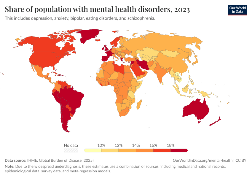 IHME, Global Burden of Disease (2025) – with major processing by Our World in Data. “Share of population with mental health disorders” [dataset]. IHME, Global Burden of Disease, “Global Burden of Disease - Prevalence and Incidence” [original data]. Retrieved March 2, 2026 from https://data-archive-fasttrack-step.owid.pages.dev:8789/20260212-172132/grapher/share-with-mental-and-substance-disorders.html (archived on February 12, 2026).