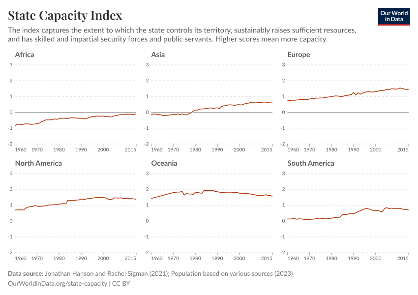 “Data Page: State Capacity Index”, part of the following publication: Bastian Herre and Pablo Arriagada (2023) - “State Capacity”. Data adapted from Jonathan Hanson and Rachel Sigman, Various sources. Retrieved from https://data-archive-fasttrack-step.owid.pages.dev:8789/20260223-071105/grapher/state-capacity-index.html [online resource] (archived on February 23, 2026).How to cite this data
