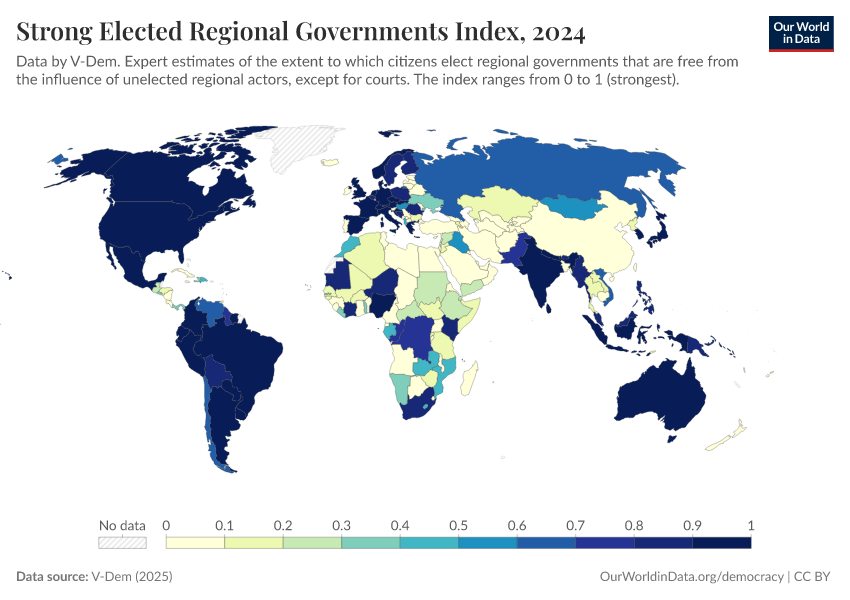 V-Dem (2025) – processed by Our World in Data. “Elected regional governments – V-Dem” [dataset]. V-Dem, “Democracy report v15” [original data]. Retrieved March 2, 2026 from https://data-archive-fasttrack-step.owid.pages.dev:8789/20260119-070102/grapher/strong-elected-regional-governments-index.html (archived on January 19, 2026).