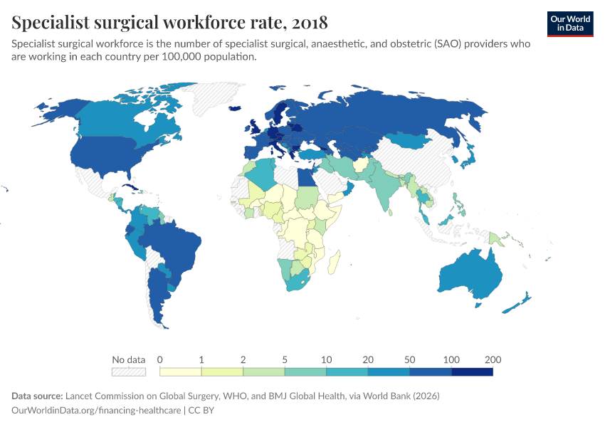 “Data Page: Specialist surgical workforce rate”. Our World in Data (2026). Data adapted from Lancet Commission on Global Surgery, WHO, and BMJ Global Health, via World Bank. Retrieved from https://data-archive-fasttrack-step.owid.pages.dev:8789/20260301-083443/grapher/surgeons-per-100000.html [online resource] (archived on March 1, 2026).How to cite this data
