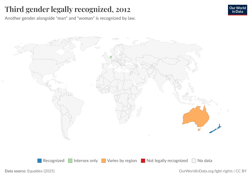 Equaldex (2025) – with major processing by Our World in Data. “Third gender legally recognized” [dataset]. Equaldex, “Equaldex” [original data]. Retrieved March 2, 2026 from https://data-archive-fasttrack-step.owid.pages.dev:8789/20250909-093708/grapher/third-gender-recognition-equaldex.html (archived on September 9, 2025).
