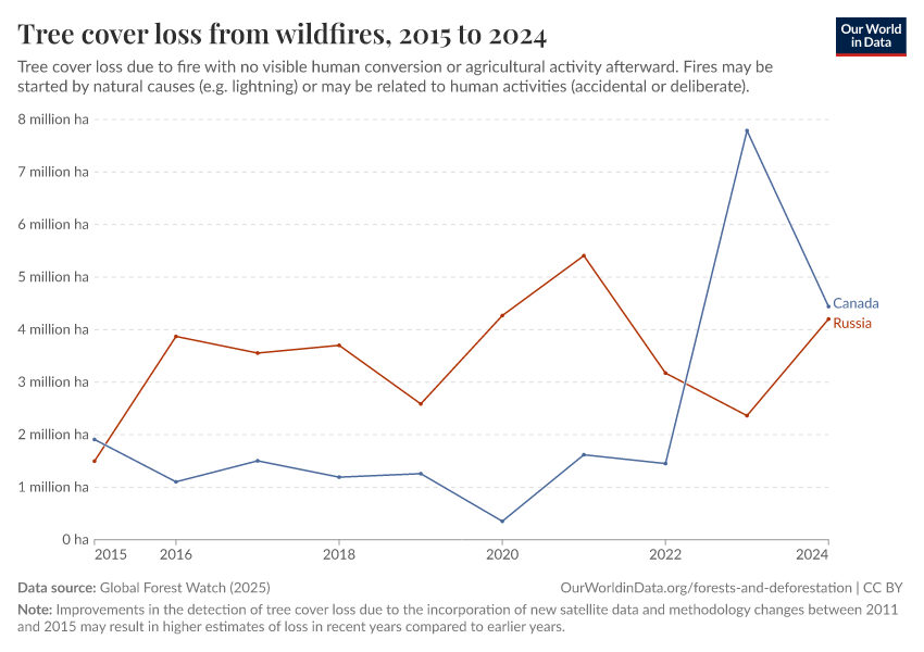 “Data Page: Tree cover loss from wildfires”, part of the following publication: Hannah Ritchie, Fiona Spooner, and Max Roser (2021) - “Forests and Deforestation”. Data adapted from Global Forest Watch. Retrieved from https://data-archive-fasttrack-step.owid.pages.dev:8789/20260119-065148/grapher/tree-cover-loss-from-wildfires.html [online resource] (archived on January 19, 2026).