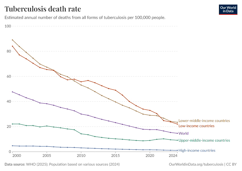 “Data Page: Tuberculosis death rate”, part of the following publication: Saloni Dattani, Fiona Spooner, Hannah Ritchie, and Max Roser (2023) - “Tuberculosis”. Data adapted from WHO, Various sources. Retrieved from https://data-archive-fasttrack-step.owid.pages.dev:8789/20260205-170810/grapher/tuberculosis-death-rate.html [online resource] (archived on February 5, 2026).How to cite this data