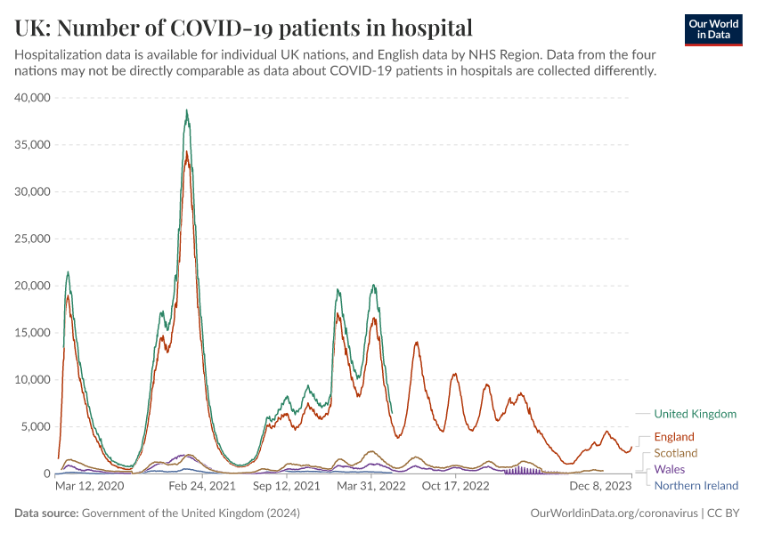 Government of the United Kingdom (2024) – with minor processing by Our World in Data. “UK: Number of COVID-19 patients in hospital” [dataset]. Government of the United Kingdom, “UKHSA data dashboard” [original data]. Retrieved March 2, 2026 from https://data-archive-fasttrack-step.owid.pages.dev:8789/20250909-093708/grapher/uk-covid-hospital-patients.html (archived on September 9, 2025).