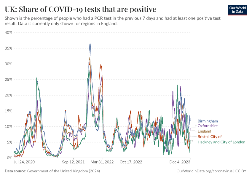 Government of the United Kingdom (2024) – with minor processing by Our World in Data. “UK: Share of COVID-19 tests that are positive” [dataset]. Government of the United Kingdom, “UKHSA data dashboard” [original data]. Retrieved March 2, 2026 from https://data-archive-fasttrack-step.owid.pages.dev:8789/20250909-093708/grapher/uk-covid-positivity.html (archived on September 9, 2025).