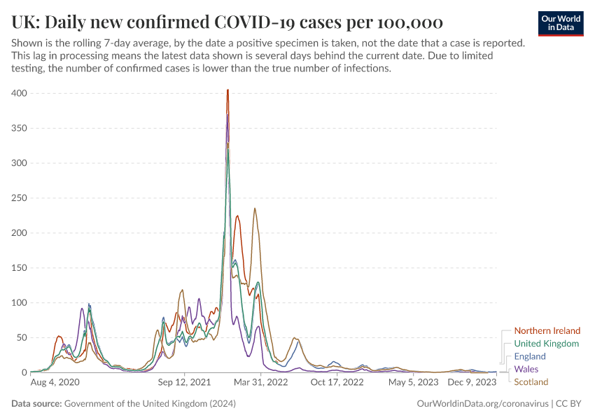 Government of the United Kingdom (2024) – with minor processing by Our World in Data. “UK: Daily new confirmed COVID-19 cases per 100,000” [dataset]. Government of the United Kingdom, “UKHSA data dashboard” [original data]. Retrieved March 2, 2026 from https://data-archive-fasttrack-step.owid.pages.dev:8789/20250909-093708/grapher/uk-daily-covid-cases-7day-average.html (archived on September 9, 2025).
