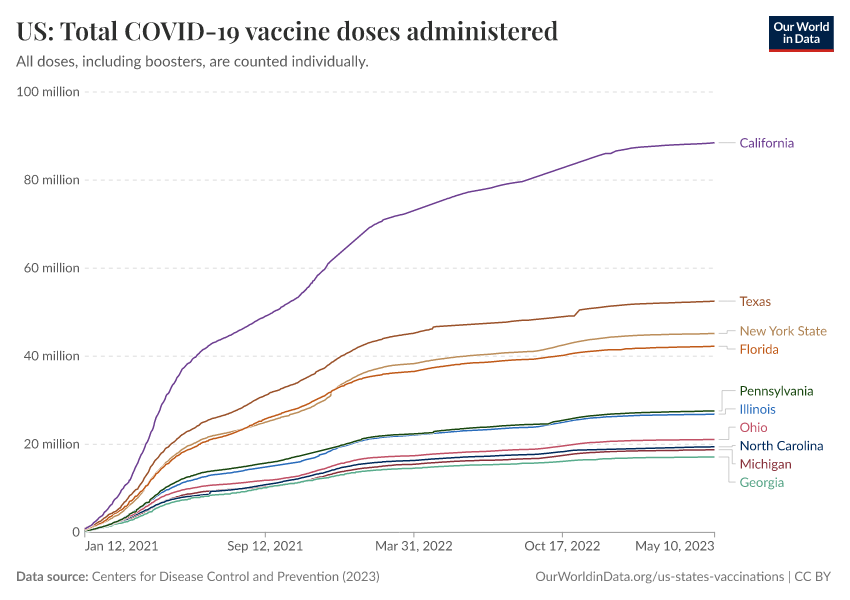 Centers for Disease Control and Prevention (2023) – processed by Our World in Data. “US: Total COVID-19 vaccine doses administered” [dataset]. Centers for Disease Control and Prevention, “COVID-19, Vaccinations (United States)” [original data]. Retrieved March 2, 2026 from https://data-archive-fasttrack-step.owid.pages.dev:8789/20250909-093708/grapher/us-total-covid-19-vaccine-doses-administered.html (archived on September 9, 2025).