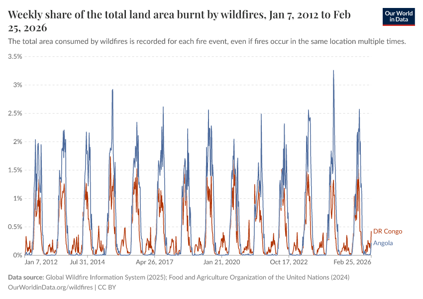 Global Wildfire Information System (2026); Global Wildfire Information System (2024); Food and Agriculture Organization of the United Nations (2024) – with minor processing by Our World in Data. “Weekly share of the total land area burnt by wildfires” [dataset]. Global Wildfire Information System, “Seasonal wildfire trends”; Food and Agriculture Organization of the United Nations, “Land, Inputs and Sustainability: Land Use” [original data]. Retrieved March 2, 2026 from https://data-archive-fasttrack-step.owid.pages.dev:8789/20260227-161508/grapher/weekly-share-of-the-total-land-area-burnt-by-wildfires.html (archived on February 27, 2026).