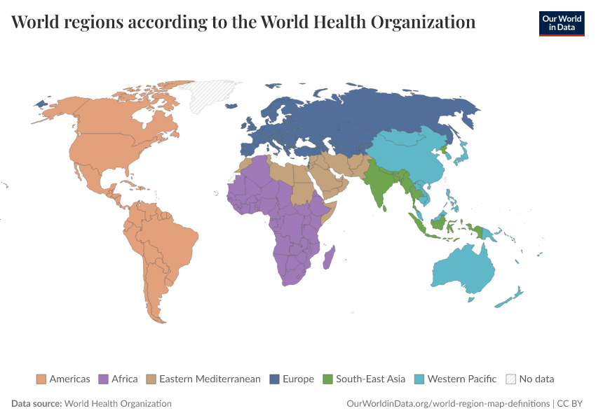 “Data Page: World regions according to the World Health Organization”. Our World in Data (2026). Data adapted from World Health Organization. Retrieved from https://data-archive-fasttrack-step.owid.pages.dev:8789/20260224-141219/grapher/who-regions.html [online resource] (archived on February 24, 2026).How to cite this data
