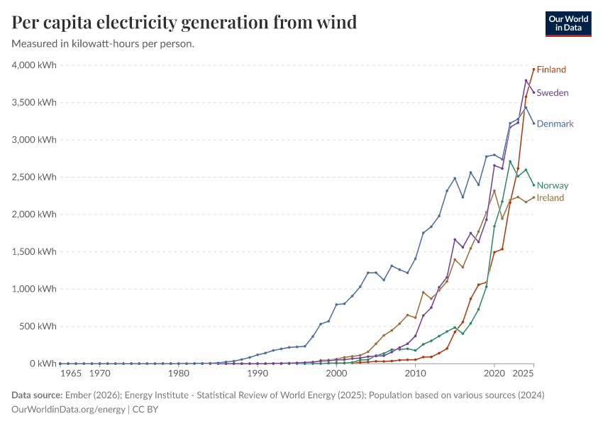 “Data Page: Electricity generation from wind power per person”, part of the following publication: Hannah Ritchie, Pablo Rosado, and Max Roser (2023) - “Energy”. Data adapted from Ember, Energy Institute, Various sources. Retrieved from https://data-archive-fasttrack-step.owid.pages.dev:8789/20260203-171503/grapher/wind-electricity-per-capita.html [online resource] (archived on February 3, 2026).How to cite this data