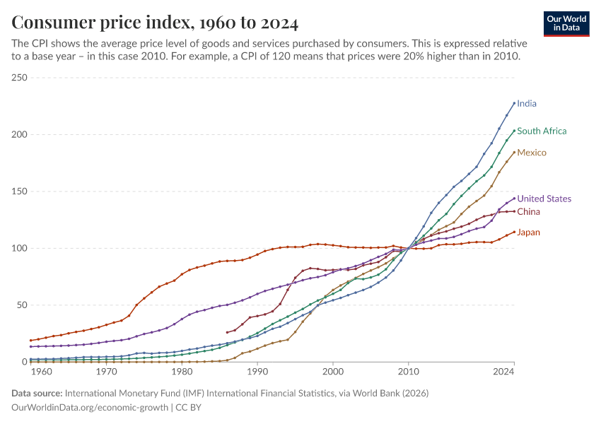 The following chart shows CPI data gathered from national statistical offices by the International Monetary Fund. The base year in this case is 2010, so a CPI of 120 means that prices rose by 20% since 2010.