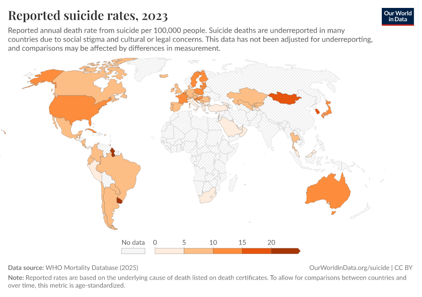 The map below shows the reported suicide rate in each country in the WHO Mortality Database (WHO MDB). It republishes reported data from all countries that have registered at least 65% of all deaths with a cause of death.