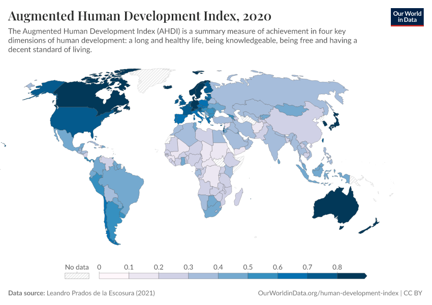 The Augmented Human Development Index (AHDI) is produced by the economic historian Leandro Prados de la Escosura.11 It gives a more historical perspective on human development by including long-run data.12