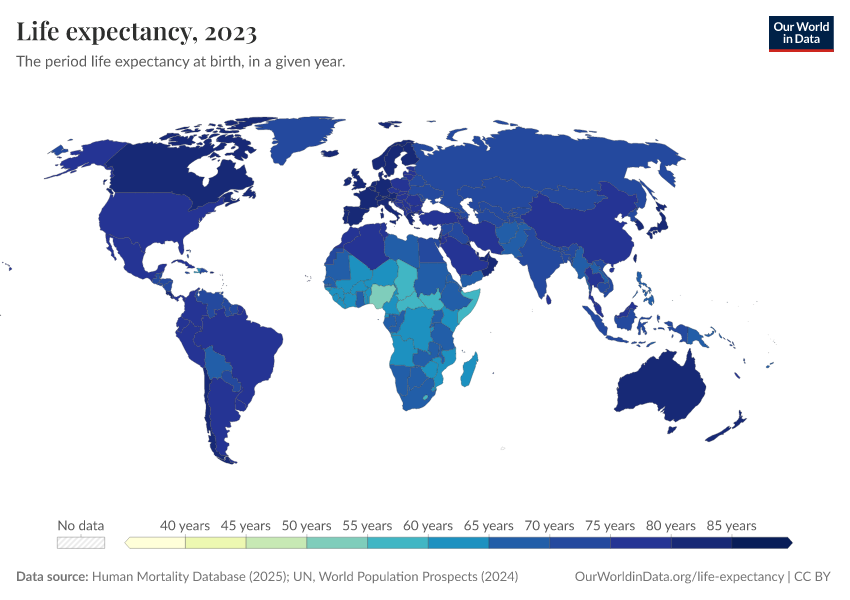 Saloni Dattani, Lucas Rodés-Guirao, Hannah Ritchie, Esteban Ortiz-Ospina, and Max Roser (2023) - “Life Expectancy” Published online at OurWorldinData.org. Retrieved from: 'https://data-archive-fasttrack-step.owid.pages.dev/life-expectancy' [Online Resource]BibTeX citation