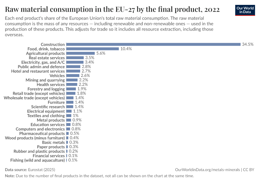 But, surprisingly, thinking carefully about these purchases is not advice that follows from looking at material footprints. The chart below shows the breakdown of the EU’s material consumption, this time by final product. We see that these consumer products account for a very small fraction of the total footprint.4