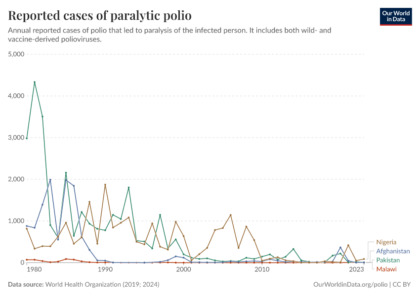 Cases have been rising in the few countries where wild poliovirus remains endemic: Afghanistan and Pakistan. We see this in the chart, which shows that cases have risen since 2017.