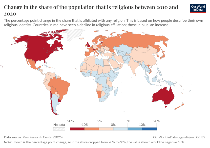 - The share of people who are religious has declined substantially in many countries between 2010 and 2020, including the United States, Canada, Australia, and much of Europe.