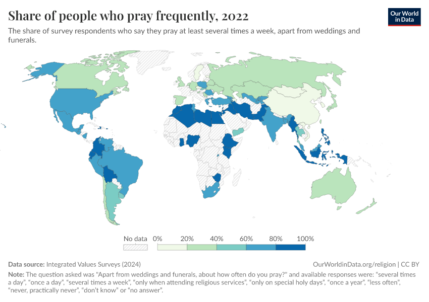 The chart below shows the percentage of people who report praying at least several times per week, excluding events such as weddings and funerals.7