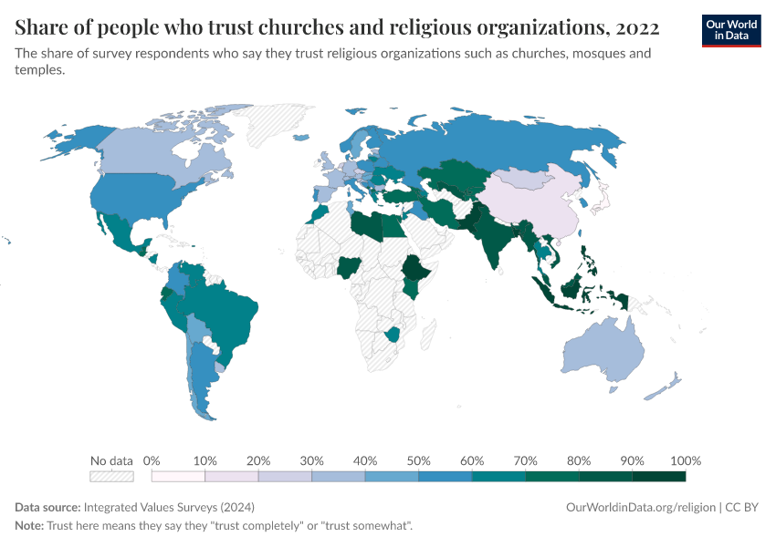 The chart below shows how much trust people place in these religious institutions. It is based on surveys asking whether respondents trust them “completely” or “somewhat”. In the survey wording, the institutions are labeled as “churches”, but it is intended to capture trust in religious institutions broadly, including mosques, temples, and similar organizations.