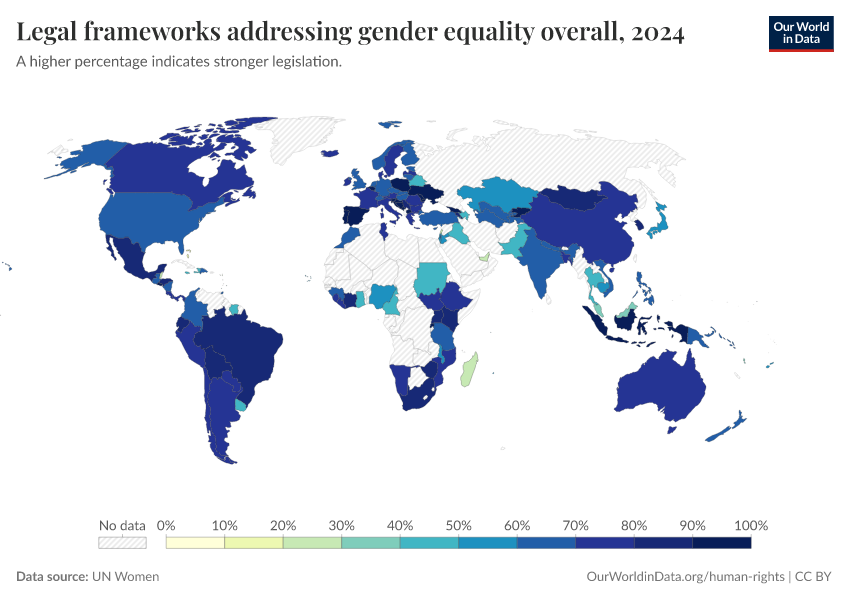This indicator measures the extent to which countries have legal frameworks in place for gender equality in four areas: (i) overarching legal frameworks and public life; (ii) violence against women; (iii) employment and economic benefits; and (iv) marriage and family. Data for this indicator is shown in the first four charts in the series of interactive visualizations.