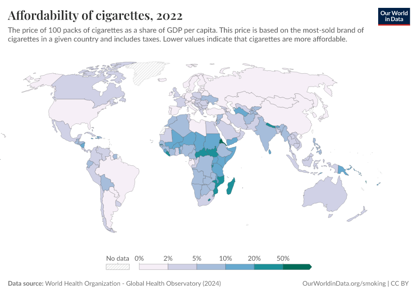 We see that daily smoking is most common across Europe and Asia – more than 20% of people in most countries in these regions smoke every day.