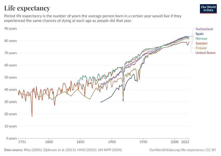 What also stands out is how abrupt and damning negative health events can be. Most striking is the large, sudden decline of life expectancy in 1918, caused by an unusually deadly influenza pandemic that became known as the ‘Spanish flu’.