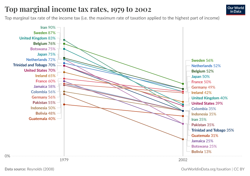 As we can see, at the turn of the 20th century the top earners in these countries faced almost zero taxation on the last part of their incomes; but this changed drastically around 1910-1930, when high top marginal rates were introduced. Interestingly, however, this lasted only until about 1980, when again all countries substantially reduced rates. Today the levels are about half of what they used to be at the highest point.