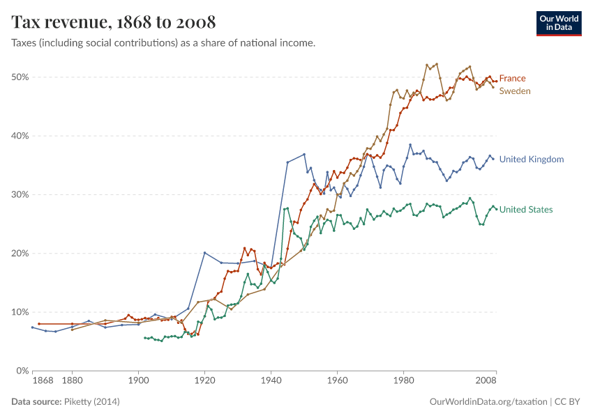 As we can see, until 1920 tax revenues were low across all these countries. Indeed, until 1910 less than 10% of national income was collected by these governments through taxation – just enough for them to fulfill basic functions, such as maintaining order and enforcing property rights.